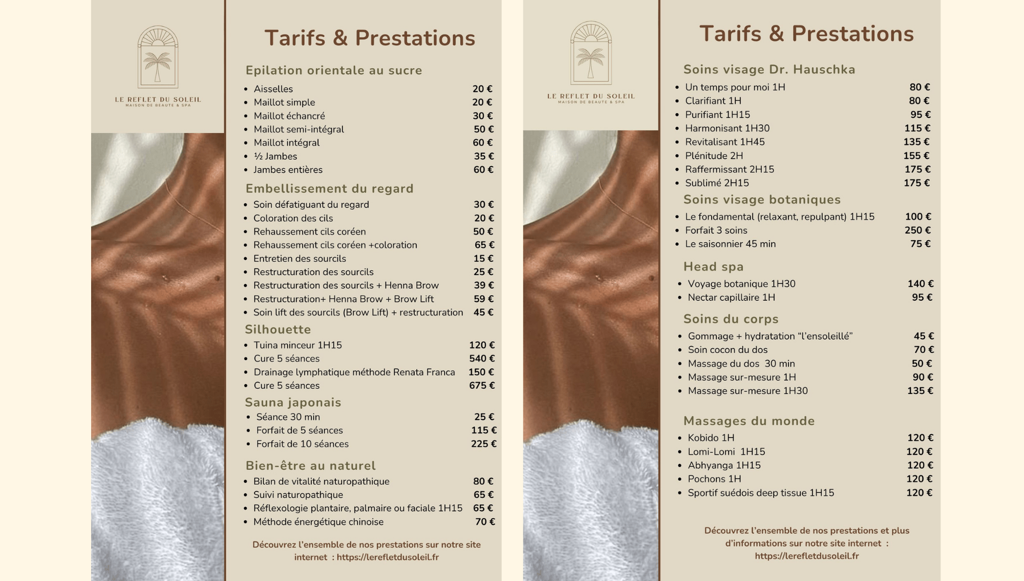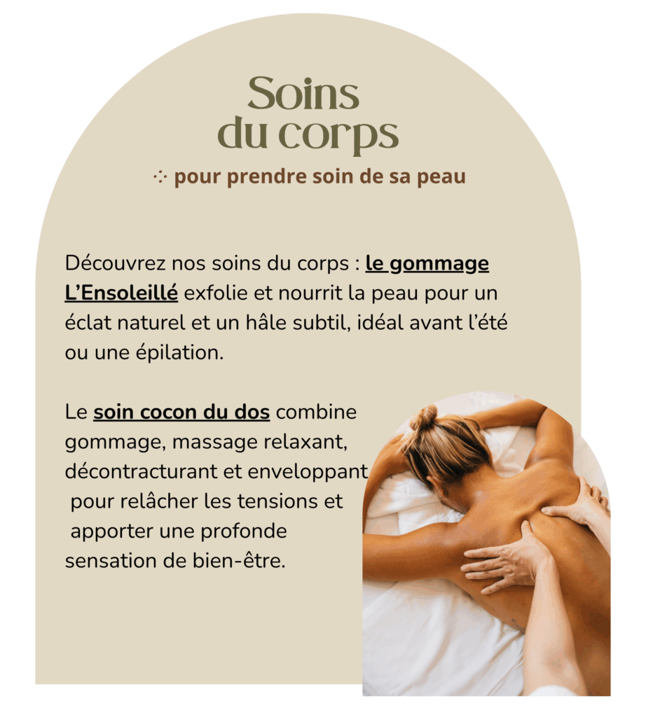 Les expériencesPrendre soin de soi, autour de différentes pratiques, entourées de nos thérapeutes expertes. Je découvre le bien-être au naturel Je prends RDV Je découvre les massages du monde Je prends RDV Je découvre la beauté mains & pieds Je prends RDV Je découvre les soins du visage Je prends RDV Je découvre l'embelissement du regard Je prends RDV Je découvre les soins silhouette Je prends RDV Je découvre les soins corps Je prends RDV Je découvre les massages sur mesure Je prends RDV Je découvre le head spa Je prends RDV Je découvre le sauna japonais Je prends RDV Je découvre les épilations au sucre Je prends RDV Tarifs et prestations Nous suivre sur Instagram le_refletdusoleilSoins visage botanique • Head spa • Épilation orientale au sucre • Massages • Sauna japonais Clean beauty🌱 à Lille – M° République Réservation 👇 Le sauna japonaisPrenez le temps pour une paren 🌟 Spécial Braderie de Lille 🌟Beauté, dé Je vous dévoile mon nouveau logo, pensé comme un ✨ Bien plus qu’un soin visage… ✨Plongez 🌿 Une bulle de douceur vous attend en plein cœ 🍯L’épilation au sucre : la méthode douce & Vous êtes thérapeute ou praticien bien-être ? ✨ Bienvenue dans mon univers ✨Je suis ravie Charger plus Suivre sur Instagram